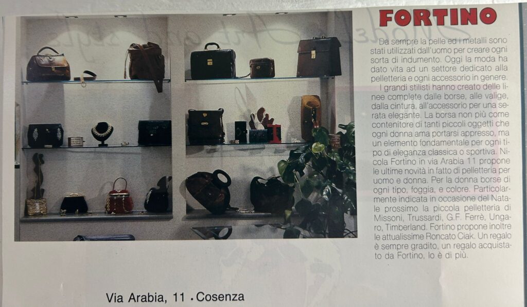 Così nacque la storia del marchio Fortino e della famiglia omonima. Filomena e Nicola raccontavano, attraverso calzature e pelletteria, una favola moderna fatta di eleganza, dettagli e speranza. La passione per quel mondo divenne una missione, portata avanti dal nipote Nicola, che decise di rinnovare l’attività di famiglia trasferendola in centro città, a Via Arabia. Negli anni ’80, con l’arrivo del pret-a-porter, venne inaugurata la prima boutique Fortino, dedicata a pelletteria e bigiotteria, e nel 1988 si ampliò, includendo anche le calzature.
